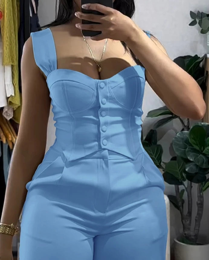 Conjunto feminino de duas peças para blusa regata de alças grossas com botões frontais, modelagem justa e calça pantalona de cintura alta